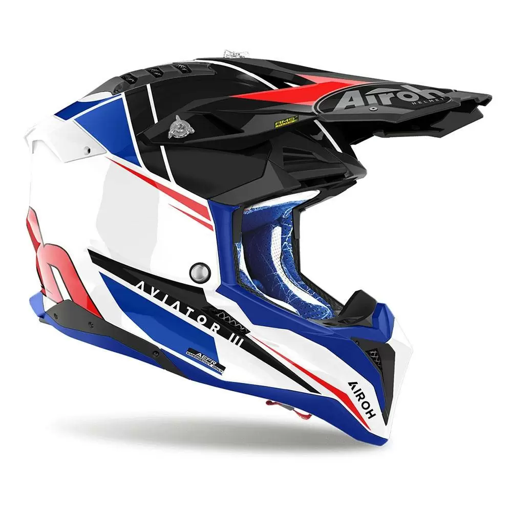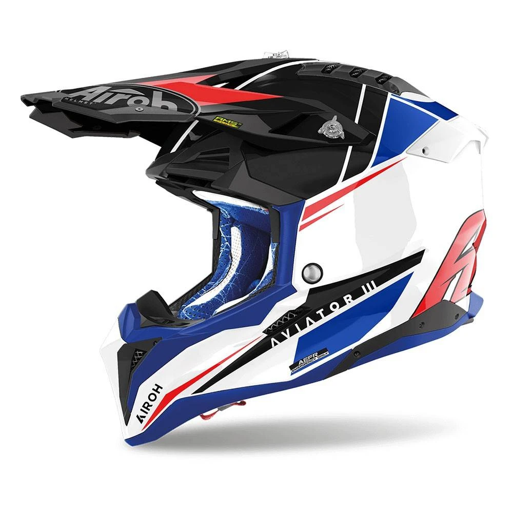 Airoh Aviator 3 Helmet in Push Blue Red Gloss. The New 2023 Airoh Aviator 3 AMS² Plus helmet raises the level of competition and redefines the standards of an off-road helmet. The shell, available in the Carbon 3K version exclusively on the Primal graphic, provides the noble HPC Carbon for the other graphics variants.