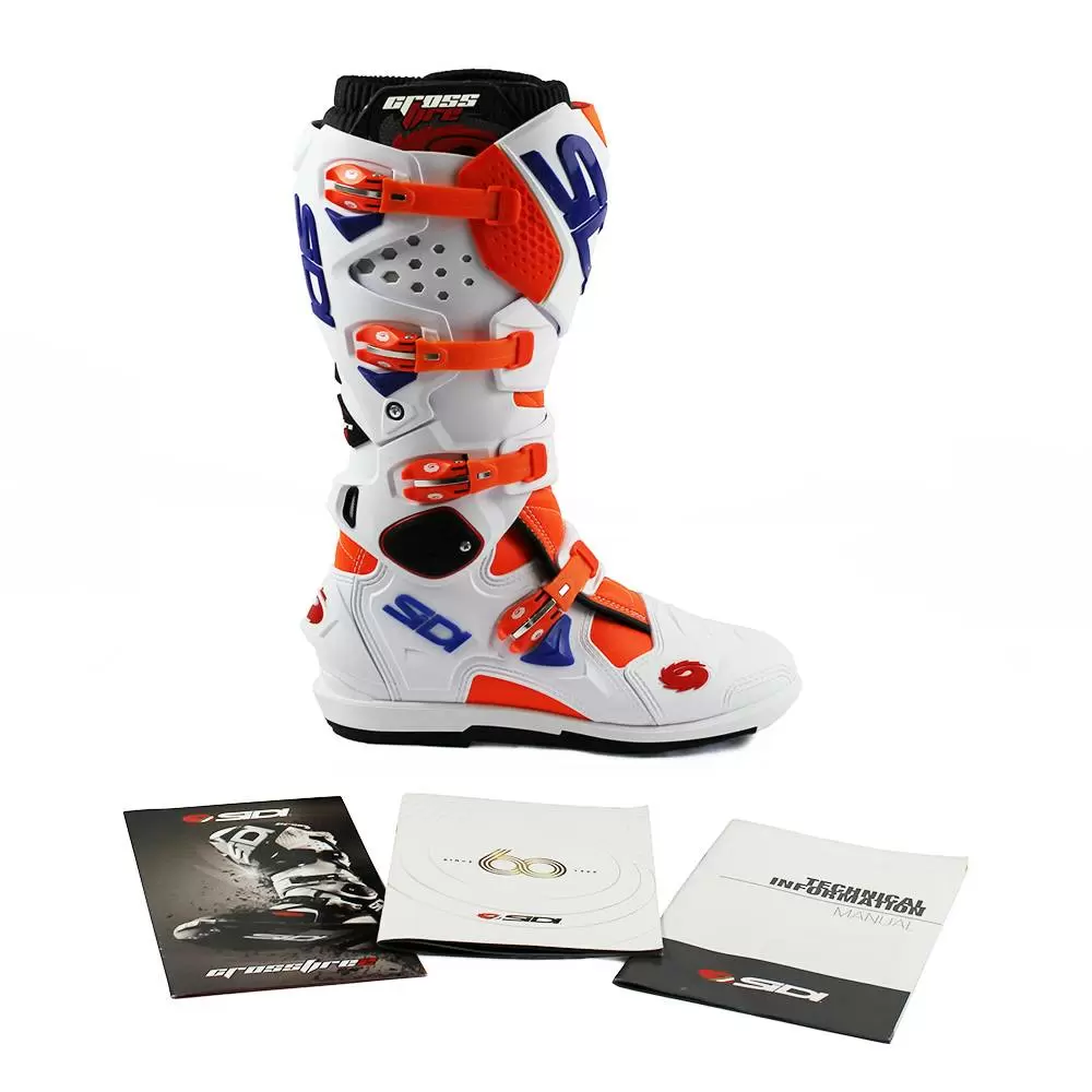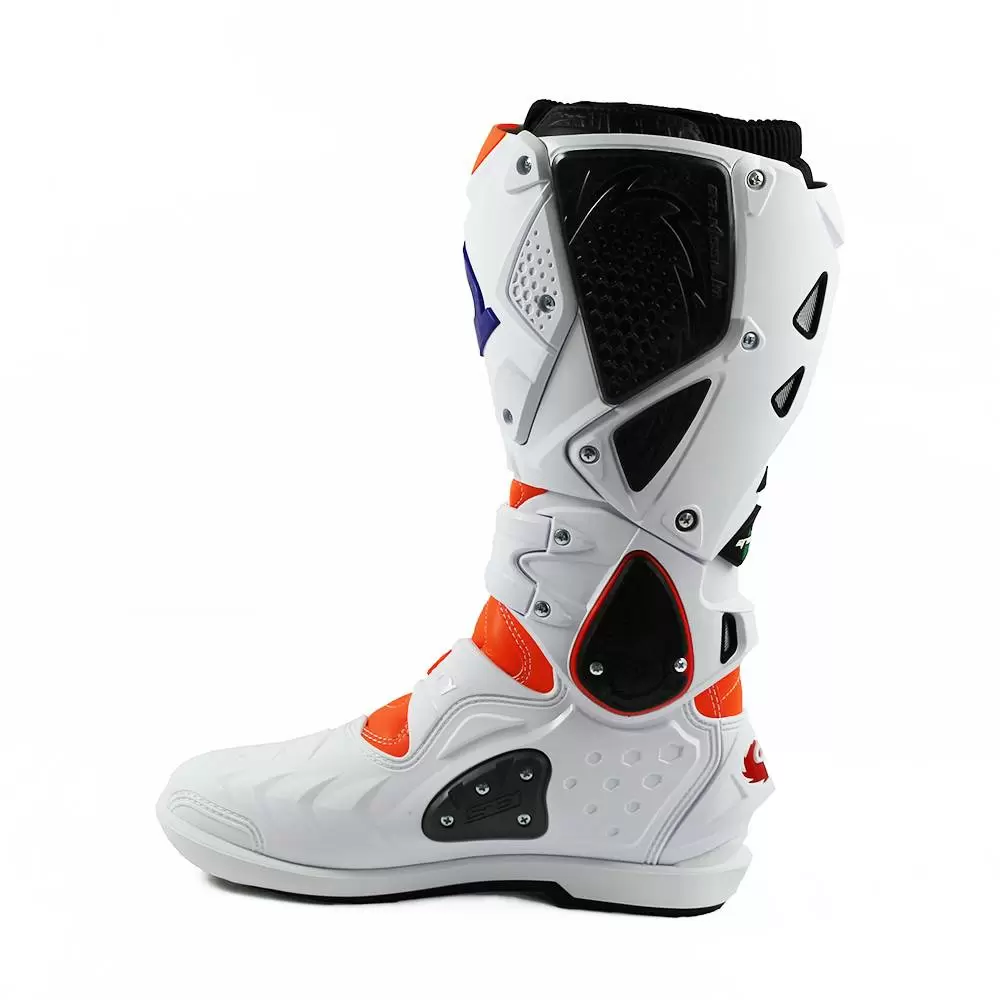 Sidi Crossfire 2 SRS Boots in Orange fluo White by Sidi®. The Sidi Crossfire 2 SRS boots are a premium off-road boot that offers more adjustability to accommodate wider calves and redesigned buckles that are easier to operate with a gloved hand. The Sole Replacement System (SRS) is a bolt-on sole design that enables a rider to swap worn soles themselves and configure the boot for different applications such as supermoto or enduro. These motocross boots are a masterful combination of protection and comfort that are worth every penny!