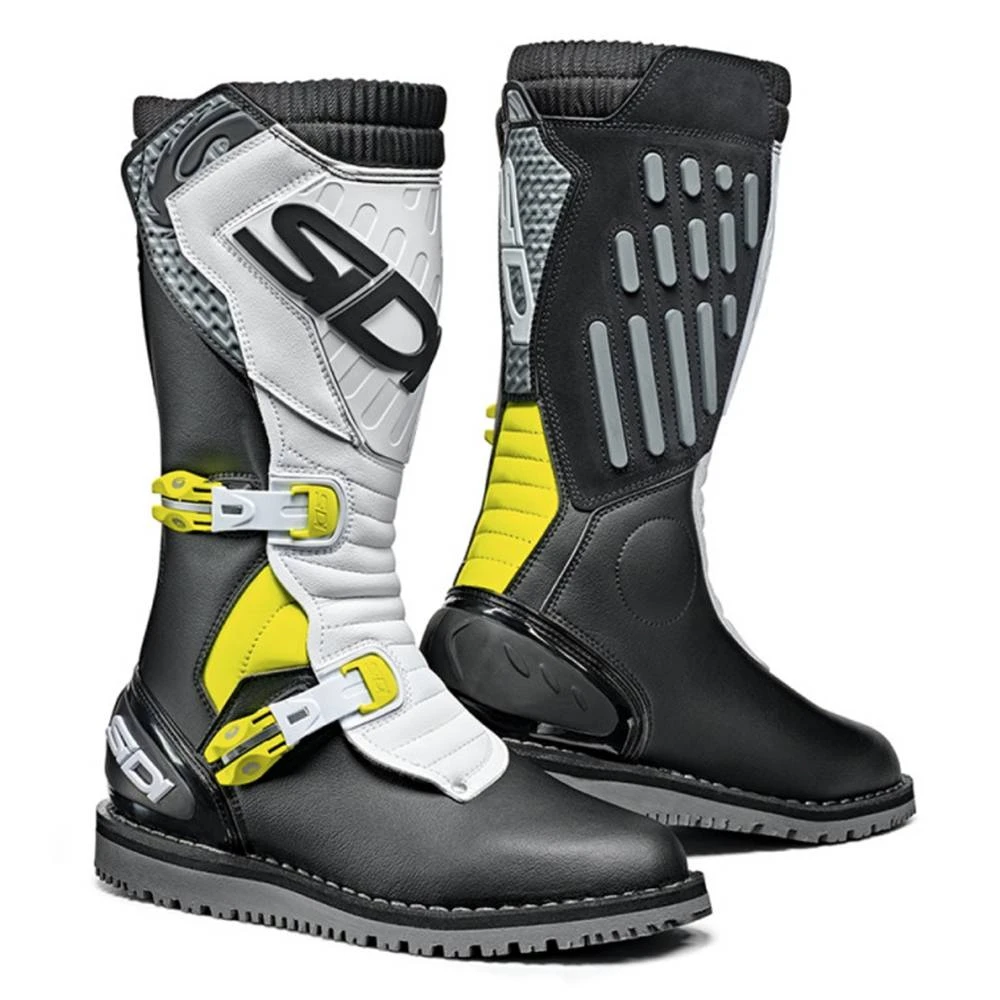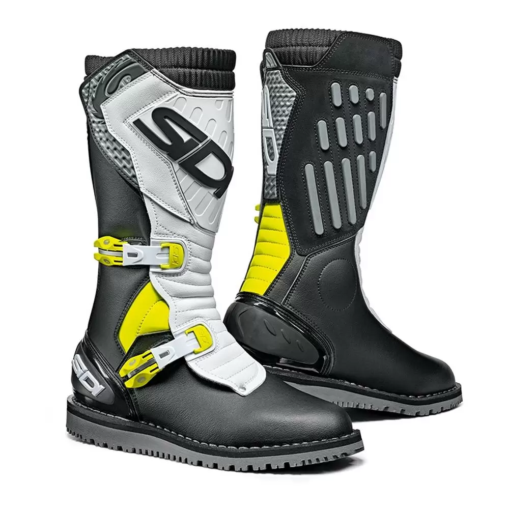 Sidi Trial Zero 2 Boots in Black Yellow White. The Trial Zero 2 Boots from SIDI continue the Italian boot maker’s long tradition of exceptional off-road footwear. Designed with the highly technical demands of the trials motorcyclist in mind, the Trial Zero.2 Boots prioritize mobility and rider-to-bike communication.