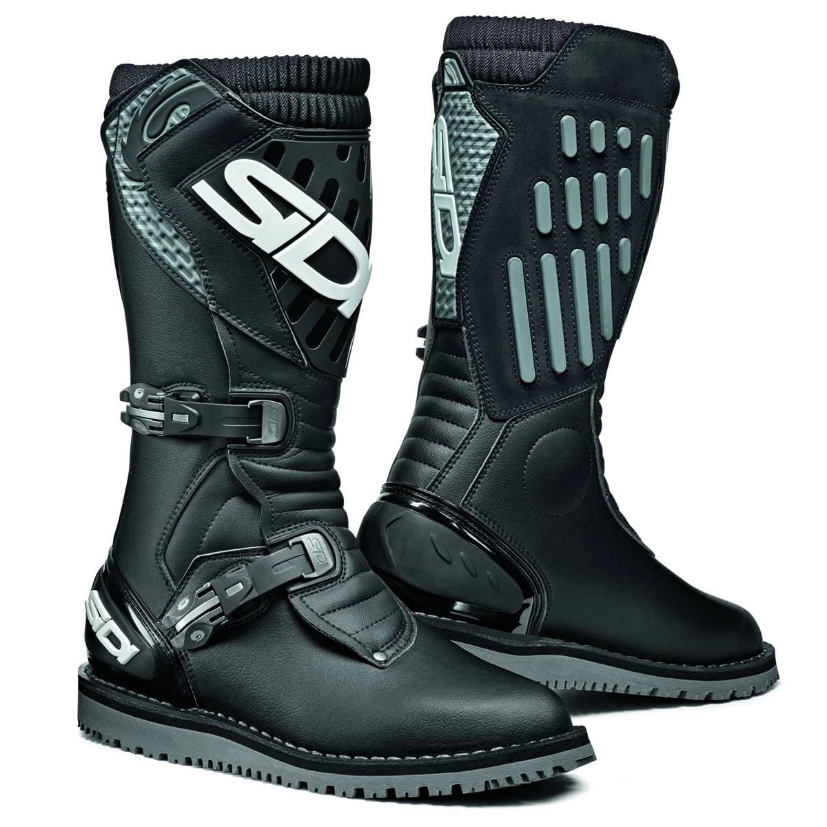 The upper is constructed of genuine suede and Technomicro synthetic leather. Boot hardware is fully replaceable and includes two cam-lock buckles per boot. The upper is secured by a large panel of VELCRO® brand hook and loop to boost the overall streamlining. And in true trials fashion, a swath of oversized rubber grips line the inner sides of the boots for traction. SIDI. The legend continues.