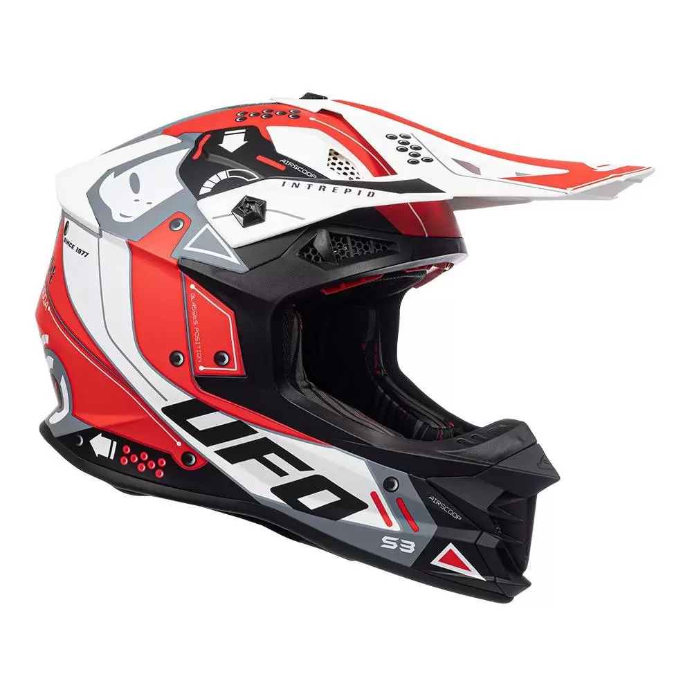 Intrepid Off-Road Helmet by UFO Plast. The UFO Intrepid helmet is equipped with a long list of features with an adjustable peak and a Double D ring retention system that ensures maximum security. It is characterised by multiple ventilation points to ensure efficient circulation of air within the helmet and maximise the rider’s experience. It has a highly breathable, removable and washable, interior fabrics, ensuring comfort even in the toughest of conditions.
